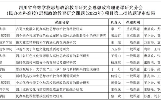 关于四川省高等学校思想政治教育研究会思想政治理论课研究分会(民办本科高校)思想政治教育研究课题(2023年)项目第二批结题评审结果的公示联盟各单位:四川省高等学校思想政治教育研究会思想政治理论课研究分会组织专家对(民办本科高校)思想政治教育研究课题(2023年)项目第二批结题材料进行了评审。本次共受理结题申请11项,经...